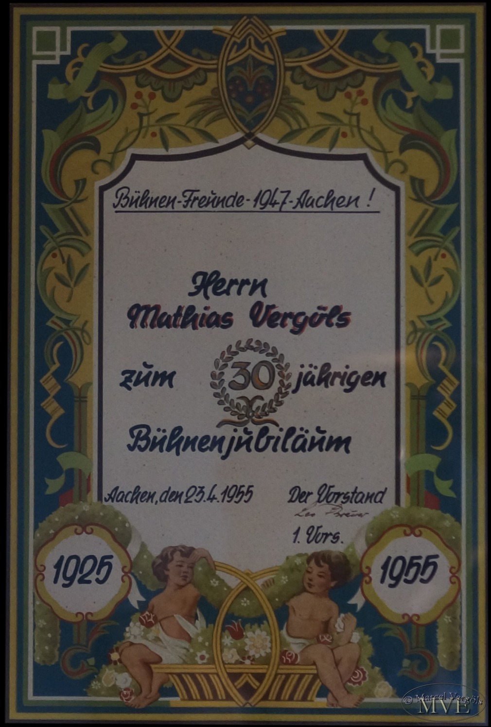 Wie sagt man so schön - "Die Welt ist so klein..." Mein Opa war bereits damals bei den Bühnenfreunden und könnte die erst 1947 als Verein gegründeten Theatergruppe mit gegründet haben. Die Urkunde zu seinem 30jährigen Jubiläum hat mein Vater nun auf dem Speicher wiedergefunden. Ob er 1925 sogar Mitgründer war, prüft der Verein jetzt in den alten Archiven nach. Mein Patenonkel Wilfried Kuckelkorn zu dem ich leider den Kontakt seit dem Tod seiner Frau (meiner Tante) verloren habe, hatte ich vor ein paar Jahren in der Stadthalle Alsdorf beim Theaterstück wiedergesehen. Er ist auch bereits seit vielen Jahren dabei und ich würde mich freuen, wenn hier nochmal ein Treffen zustande käme. Somit versteht es sich irgendwie von selbst, den Verein aktiv zu unterstützen.