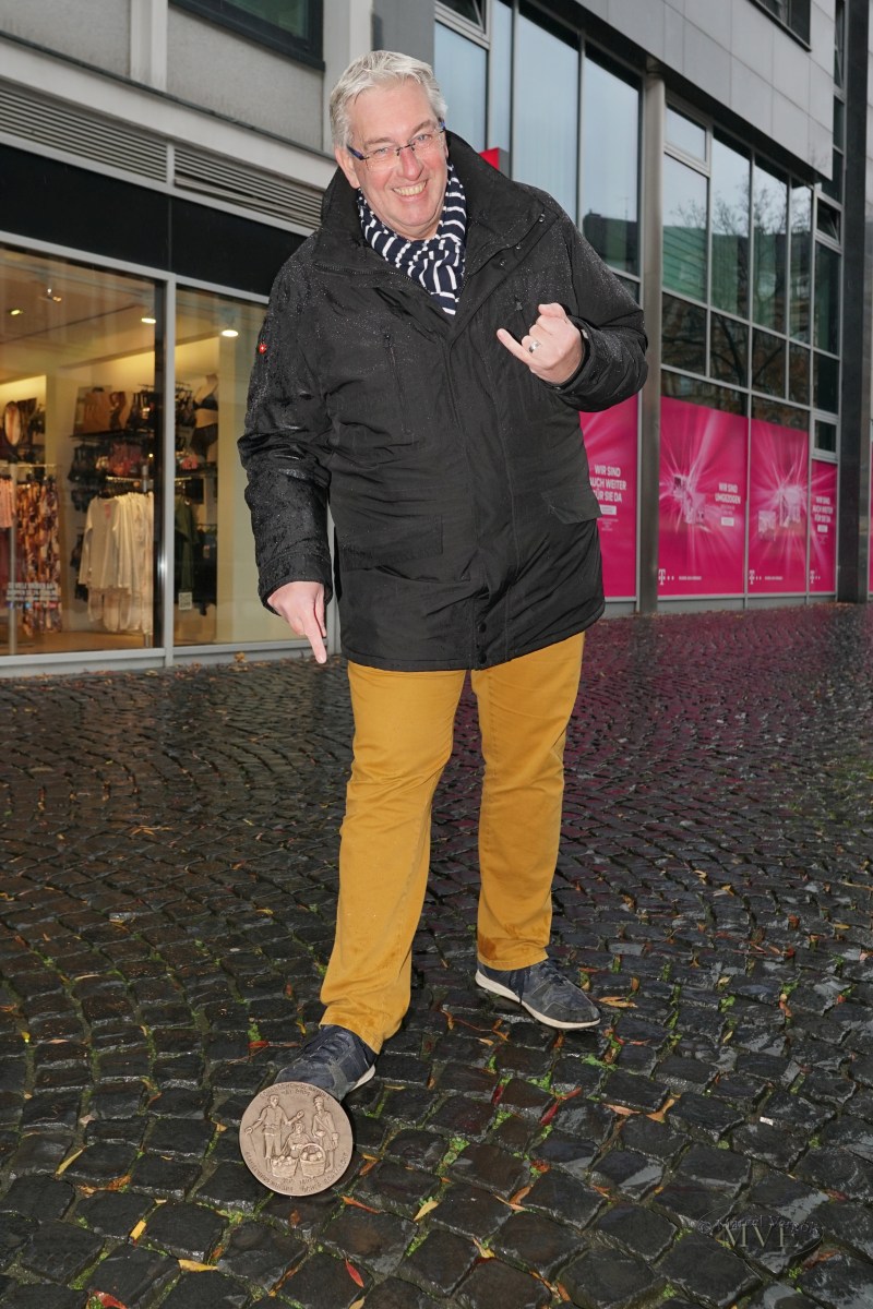 Damit wir den ungefähren Stellplatz auch genau markieren konnten, hatte Dirk Chauvistré eine der limitierten Bronzeplatten mit und markierte den Boden. Und damit man das Denkmal nicht mit den anderen Bodenmarkierungen aus Bronze verwechselt habe ich die Bilder in die kleine Galerie hinzugefügt und erkläre gerne einmal die Bedeutung.